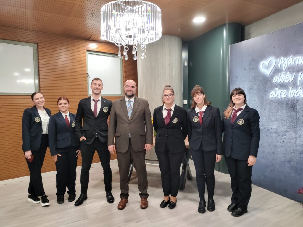 At a lunch hosted by the chef ambassadors of Thessaloniki, in the foyer of the Thessaloniki City Hall in honor of the President of the Republic of Greece. Me as the person in charge, with my team – students who carried out the service